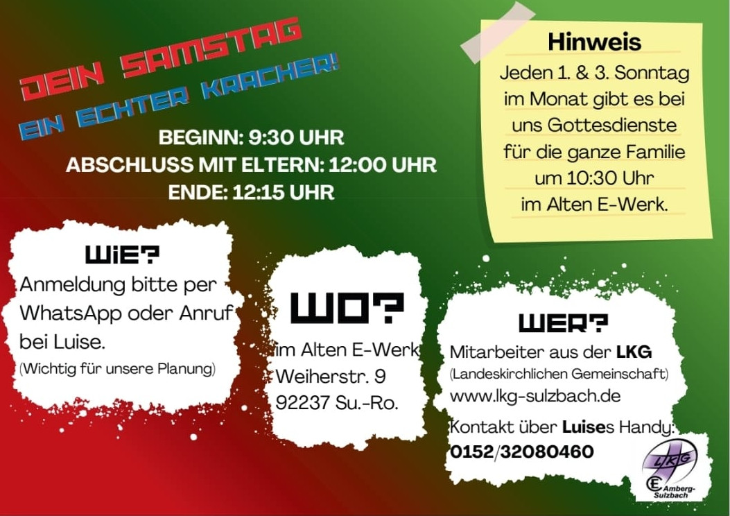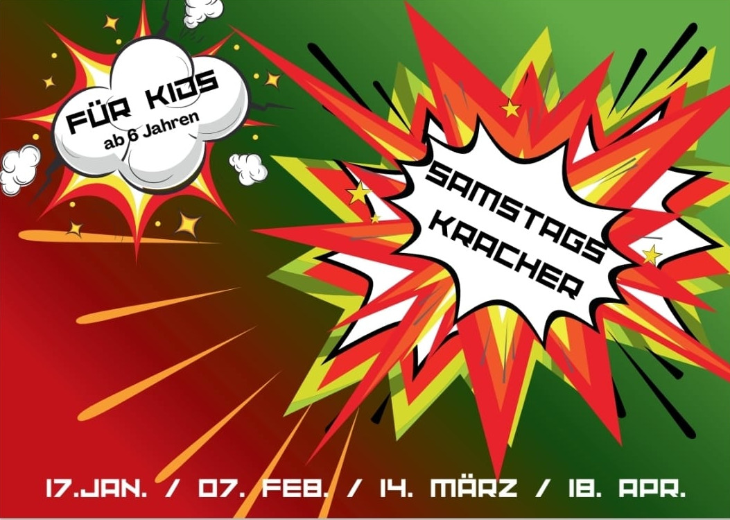 Einmal im Monat sind Kinder ab dem Grundschul-Alter zu einem bunten Vormittag mit Spielen, Liedern, Basteln, Werken und biblischen Geschichten eingeladen um es "krachen" zu lassen. In der Zwischenzeit können Eltern entspannt einkaufen, einen Kaffee trinken, ... Startschuss ist um 09.30 Uhr. Um 12.00 Uhr gibt es einen kleinen gemeinsamen Abschluss mit den Eltern. Offizielles Ende ist dann um 12.15 Uhr.